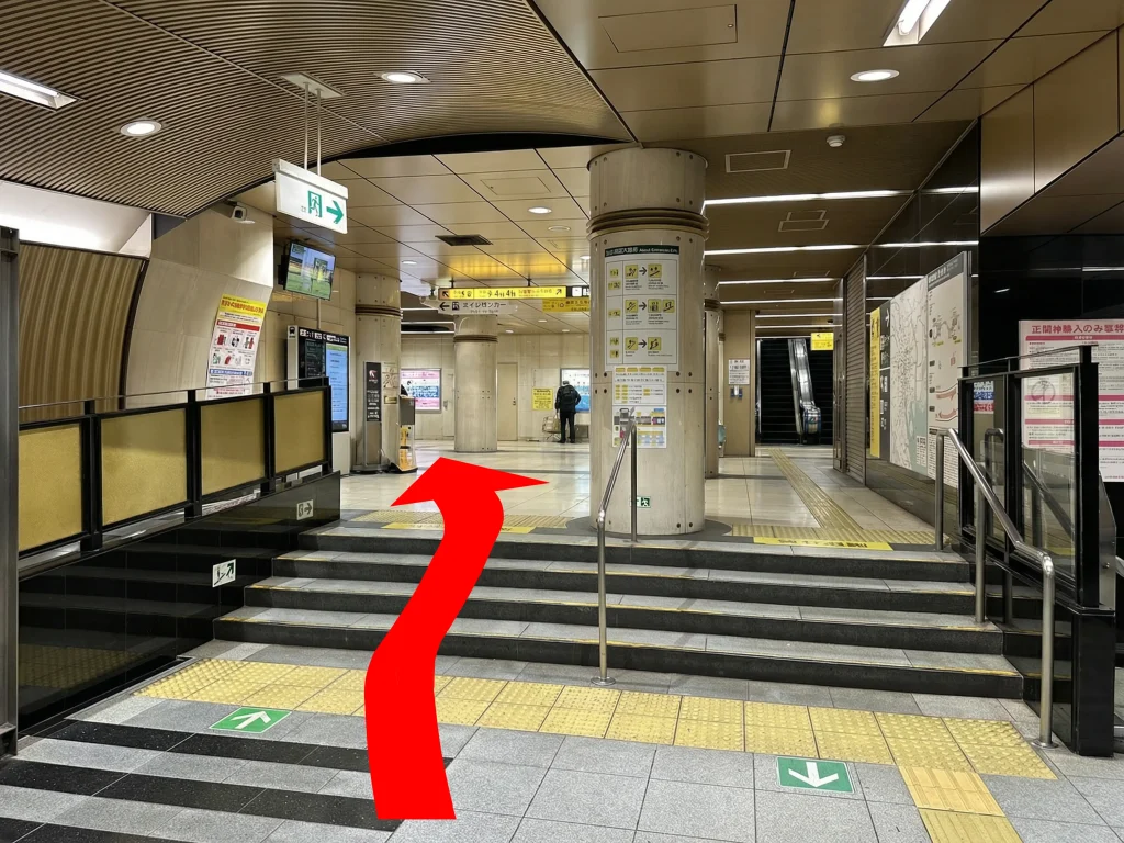 階段を下りたら右へ進み、突き当りを右に曲がって階段を上ります。