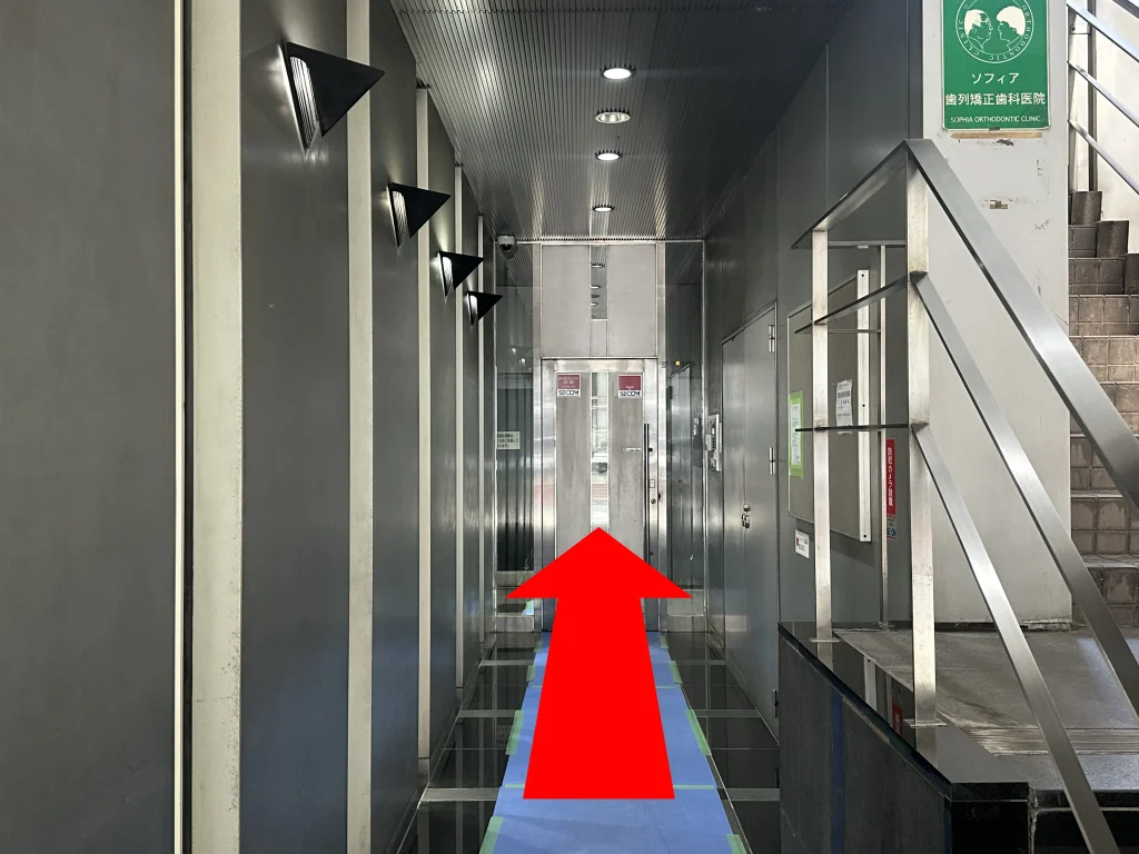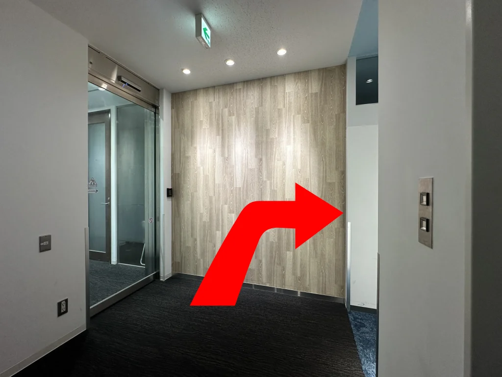 突き当りのドアを開けるとエレベーターがありますので、3階へ上がってください。