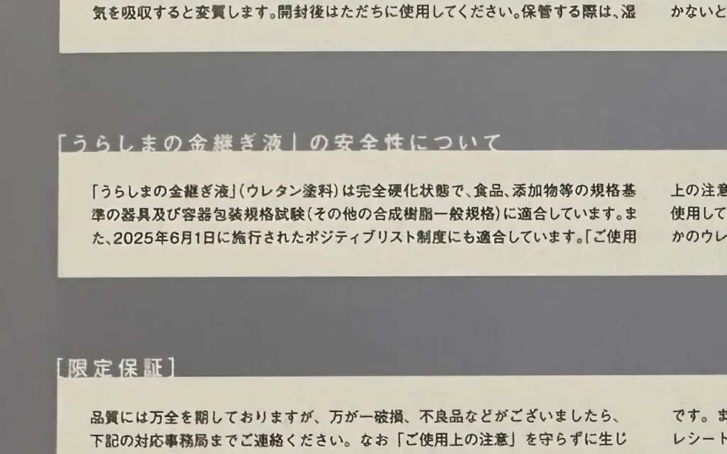 本の裏側を見ると、『うらしまの金継ぎ液』については、ポジティブリスト制度に適合しているようですが、残念ながら表面だけ適合していても食器としては使用できません。